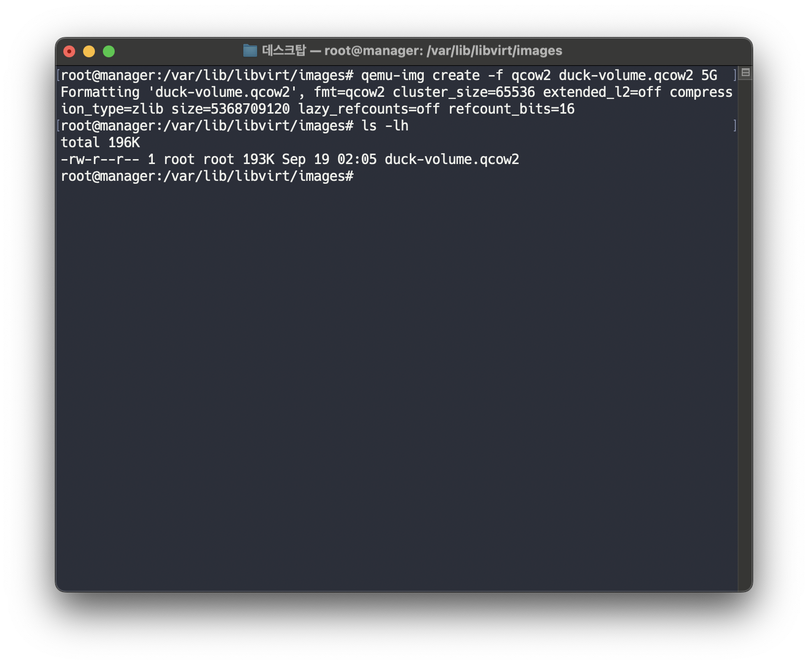 duck-volume.qcow2라는 이름의 5GB짜리 파일을 생성하겠습니다. VM과 분리되어 데이터를 영구적으로 보관할 독립적인 저장소입니다.