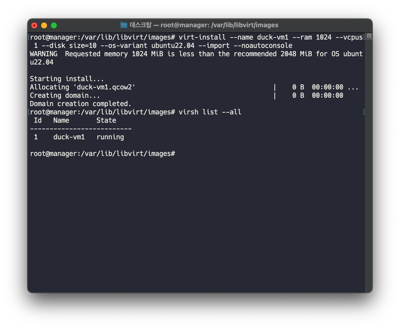 virt-install 명령어로 1GB RAM, 1 vCPU 사양의 duck-vm1을 생성합니다. OS가 설치될 기본 디스크(vda)는 자동으로 함께 만들어집니다.