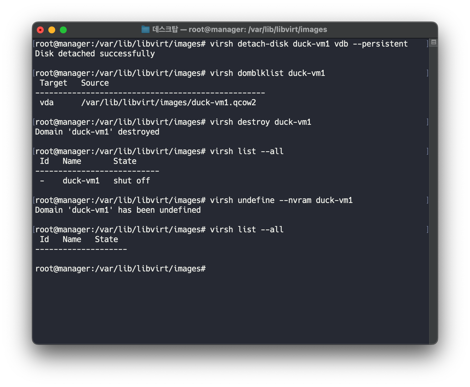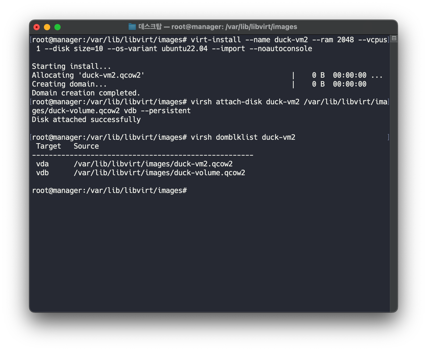 볼륨 연결: virsh attach-disk 명령어로 duck-vm1에 duck-volume.qcow2을 두 번째 디스크(vdb)로 연결합니다.